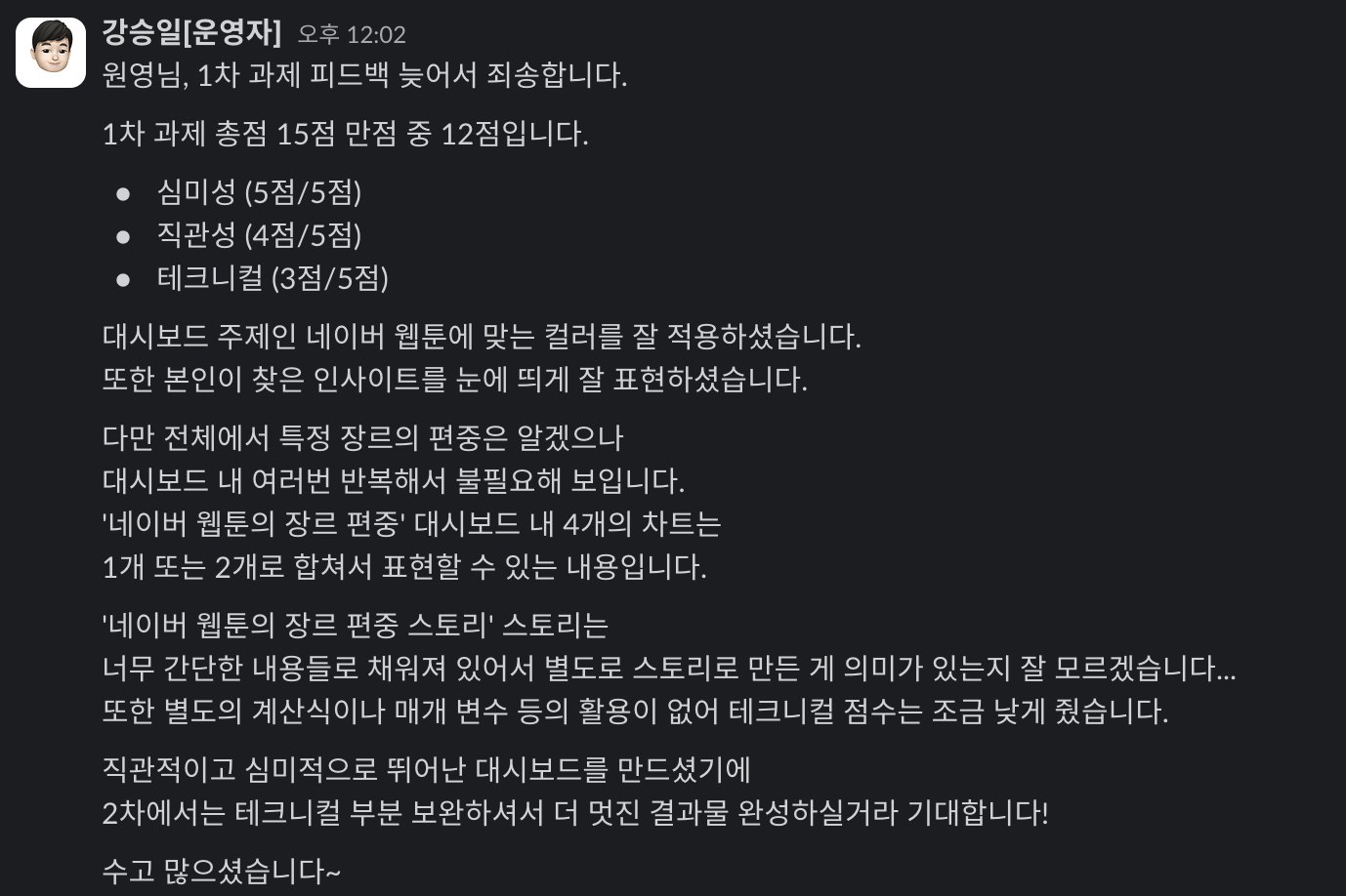 피드백에서 말씀해 주신 차트의 중복 부분은 다음에 차트를 만들때에도 주의해야할 것 같다. 실제값과 비중을 모두 시각적으로 표시하고 싶어 차트를 여러개 사용했는데, 대시보드를 보는 입장에서는 중복이라고 생각된 것 같다. 실제값으로 막대그래프를 만들고 비중은 레이블로만 처리하는 방법이 있을 것 같다. 또한, 성인 웹툰을 따로 뺀 것에 대해서도 중복되는 것 같다는 피드백을 추가로 주셨다. 차트를 늘어뜨리기 보다는 매개변수를 이용하여 차트의 값을 변경하는 방법으로 대시보드를 구성하는 것도 좋을 것 같다는 말씀을 해주셨다.
