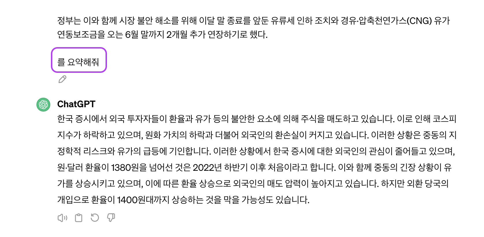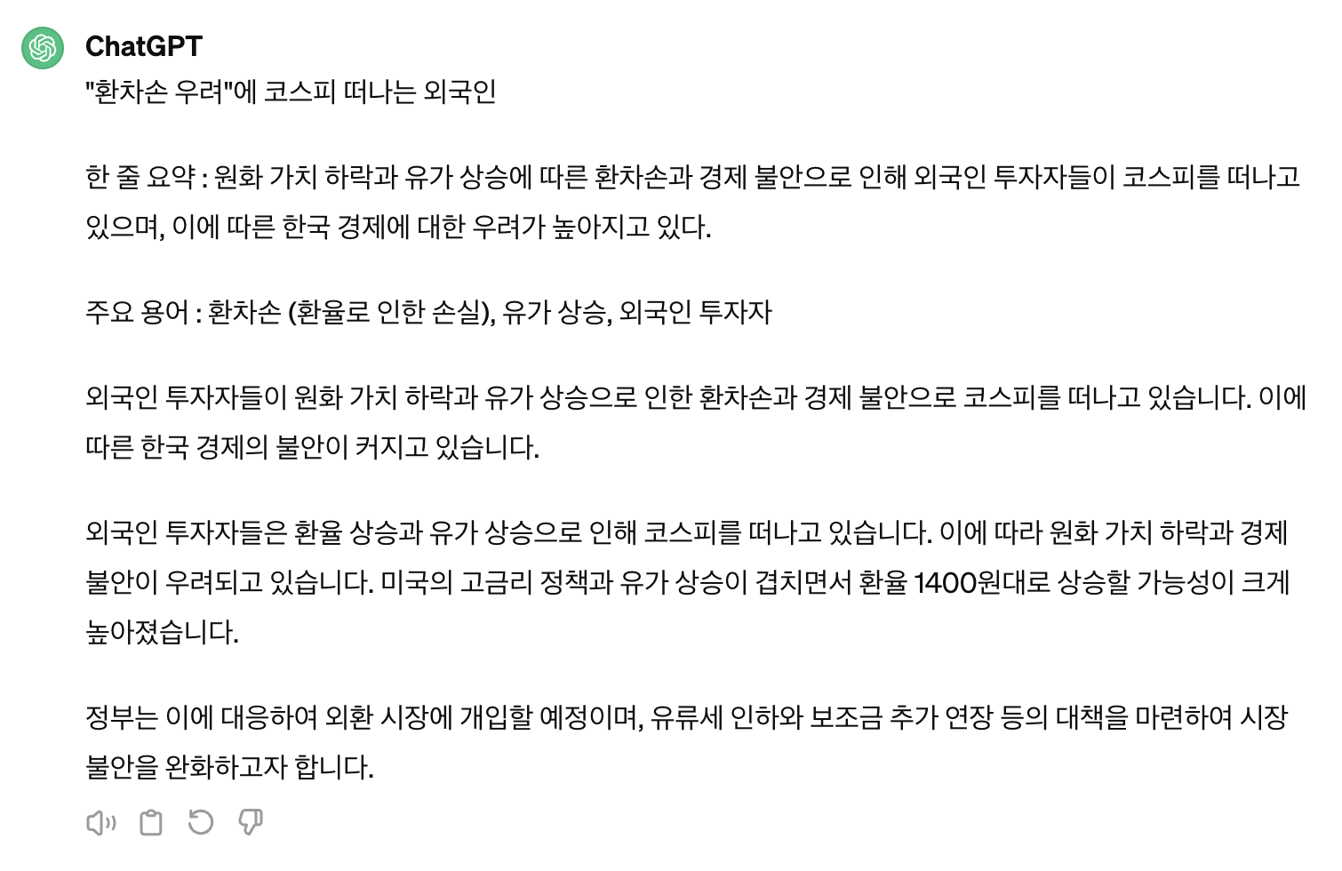 그냥 기사를 요약해달라고 요청한 것과 차이가 크다. 아래 사진은 프롬프트를 구체적으로 제시하지 않고 그냥 요약해달라고 한 경우이다.