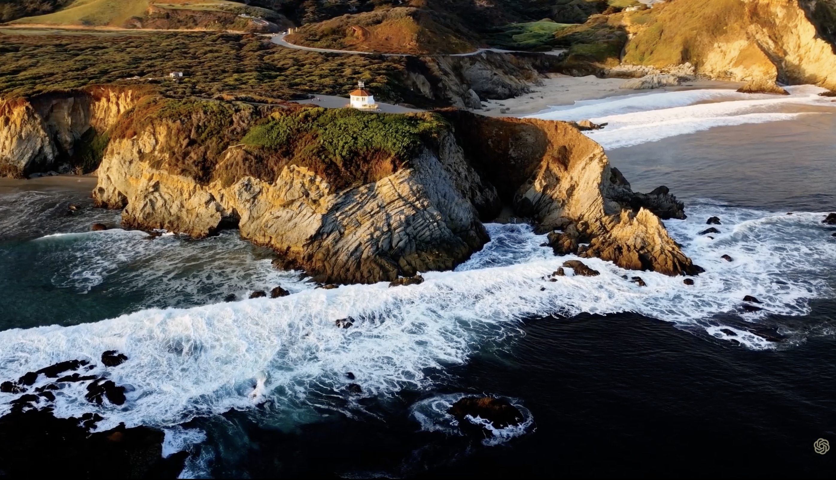 Prompt: Drone view of waves crashing against the rugged cliffs along Big Sur’s garay point beach. The crashing blue waters create white-tipped waves, while the golden light of the setting sun illuminates the rocky shore. A small island with a lighthouse sits in the distance, and green shrubbery covers the cliff’s edge. The steep drop from the road down to the beach is a dramatic feat, with the cliff’s edges jutting out over the sea. This is a view that captures the raw beauty of the coast and the rugged landscape of the Pacific Coast Highway.