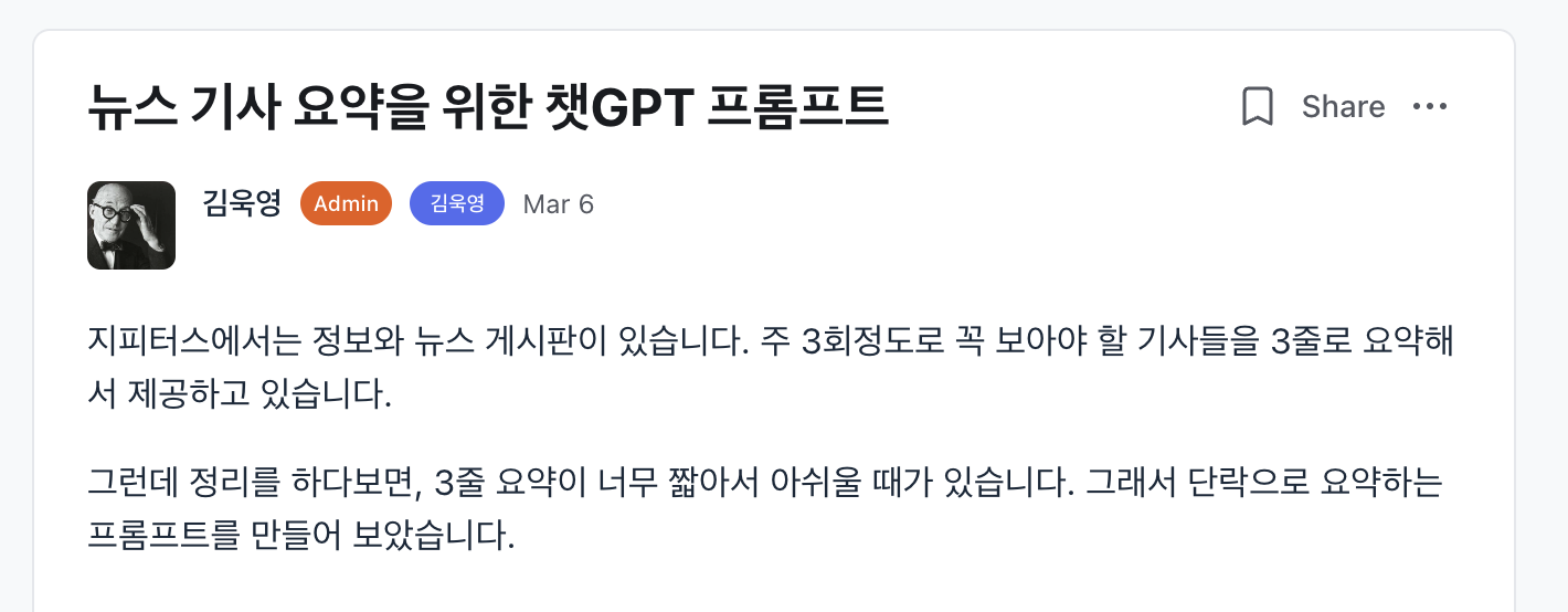 GPT로 무엇을 할지 기획이 필요했다. 거창하게 하기보다는 빠르게 실행할 수 있는 기획안이 필요했다. 혼자서 생각하기에는 좀 어려워서 지피터스 커뮤니티를 돌아다니다 "뉴스 기사 요약을 위한 챗GPT 프롬프트"라는 글을 보게 되었다.