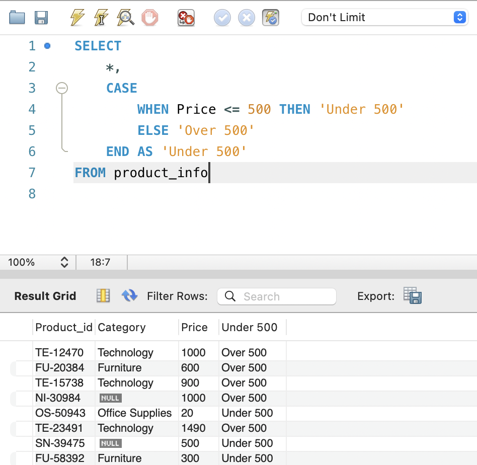 아래 쿼리는 product_info 테이블에서 Price가 500이하인 제품과 초과인 제품으로 분류하는 컬럼을 만드는 쿼리이다.